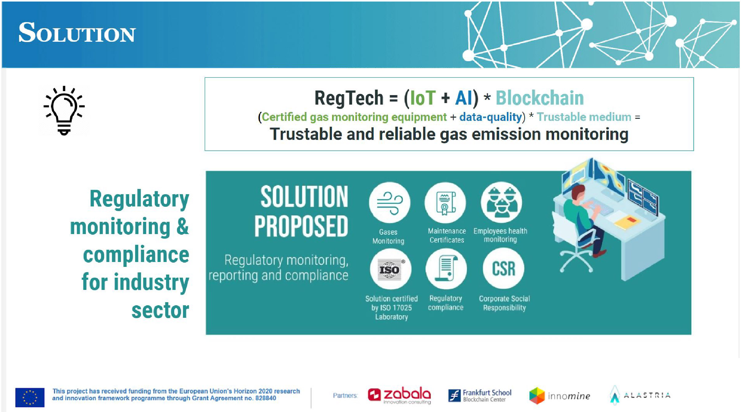 The integration with the blockchain technology has already started, using the B Besu Alastria network which is already regulated and congruent with the European network, and HOPU focuses the next step towards CEF EBSI (European Blockchain Services Infrastructure) also based on BESU, as an evolution of the Alastria network. This innovation will mean a further jump in the quality of HOPU services for Industry 4.0, where gas emissions suppose more than 7M of deaths per year in the world and more than 1,600M euros are dedicated to complying penalties for regulation non-compliance.